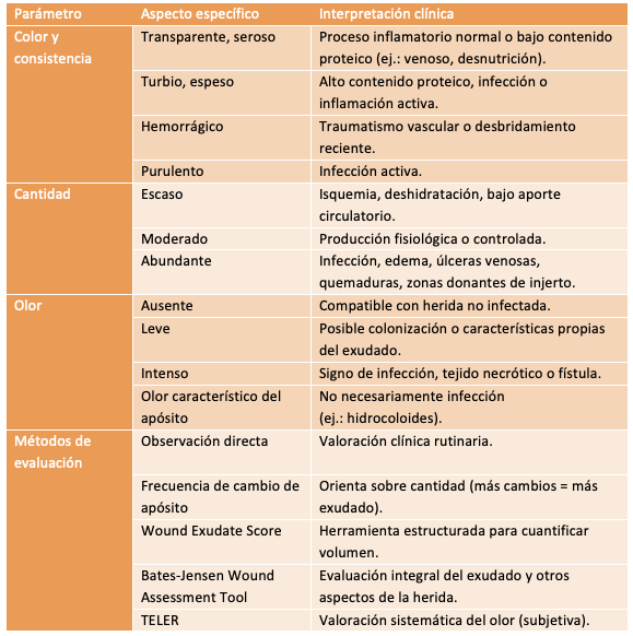 La correcta gestión del exudado requiere una valoración completa que contemple tanto sus características como el estado general del paciente y su contexto social. Este enfoque integral contribuye a optimizar la cicatrización y a mejorar la calidad de vida.(1,2)